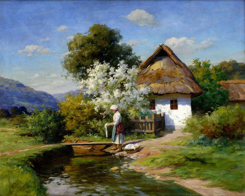 46 000,- Sk Na okraji dediny. Okolo 1900. Olej na plátne. 49 x 58 cm. (35. zimná aukcia, 3. 12. 2002)
