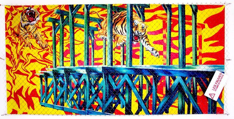 Popis: Dielo "Les Fauves devant et deriere", ústredná časť diplomového cyklu Marcela Mališa, osobitým jazykom rozpráva o absurdite dneška, množiacej sa agresii, našej "radosti" zo smrti, z ktorej sa postupne stáva obchodný artikel (multiplikované šibenice). Je vyjadrením starého "truizmu" že smrť rozdávaná v mene vyšších cieľov motivuje len k ďalšej smrti, vytvára cyklenie, ktorého sa človek a spoločnosť ťažko vzdávajú (vojna s terorizmom, alebo stret civilizácií a náboženstiev). Prostredie cirkusovej manéže počas tigrej revue slúži Mališovmu kritickému zámeru, pričom použitie reálneho oplotenia, umožuje umelcovi istejšie vykročenie k divákovi a podporuje agresívnu a čiastočne absurdnú vizualitu. Tento nečakaný prvok symbolicky ochraňuje diváka pred nebezpečím ohrozenia; zároveň stotožňuje recipienta, človeka so šelmou. Vytvára zároveň sarkasticky komentár ku galerijnej praxi: dodržuj odstup od vystavených diel. Marcel Mališ sa narodil 27. 8. 1978 v Bratislave. 2001-2007 študoval na Vysokej škole výtvarných umení v Bratislave (prof. D. Fischer). Zúčastnil sa skupinových výstav Pekní chalani (Bratislava, 2004), Friezone (Viedeň 2004) a Večne hladní (Bratislava, 2005).