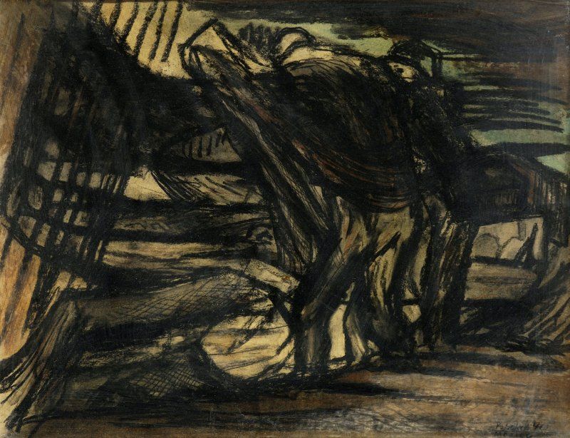 Popis: "Vysťahovalci (Mexický motív)" sú galerijne a zberateľsky mimoriadne cenným (diela tohto typu sa trhu fakticky nevyskytujú) dokladom tvorby Kolomana Sokola z jeho najlepšieho (mexického a potom amerického) obdobia rokov štyridsiatych. Tú spoznala širšia domáca verejnosť až roku 1946 na súbornej výstave, ktorú mu usporiadal Blok slovenských výtvarných umelcov v Bratislave. Vystavil na nej aj pomerne neveľký súbor 28 obrazov, v ktorom premiérovo ukázal viaceré kľúčové diela z rokov 1938-1946. Z odstupu času je nepochybné, že Sokolovo umenie sa práve v tom čase pridalo k viacerým ďalším, rovnako orientovaným podnetom pre štýlovú a myšlienkovú úpravu programu dvoch najmladších generácií našej maľby. Potvrdzuje to aj všeobecné dobové presvedčenie, že Sokolovým návratom došlo k zhode dvoch výtvarných koncepcií, rozvíjajúcich sa dovtedy bez možnosti kontaktov a blízkych len onou zvláštnou schopnosťou výnimočných umeleckých osobností intuitívne reagovať na podnety "ducha doby". Na jednej strane tu bola ikonografia vojnovej tvorby majerníkovskej vetvy generácie, inotajnej reči jej zástupov putujúcich ľudí, vojnových vyhnancov, ľudí (či ľudstva) bez domova a bez nádeje. Sokolova mexická kresba rokov 1940--1941 ponúkala až neuveriteľne podobné riešenia v scénach pohrebných sprievodov, významovo mnohoznačných zhlukov anonymných postáv mexických vidiečanov vo vyprázdnenom, neindetifikovateľnom priestore (Munumeto - Nad mŕtvym druhom, 1940; Patio, 1940; Entiero, 1940). Tajomná mágia do vlastného vnútra zahľadených, akoby slepých ľudských tvárí, portrétov mŕtvych indiánov, starých žien bola pre Sokola zasa predovšetkým podobenstvom smrti, zániku, večnosti (Mŕtvy indián, 1940; Nárek, 1940; Plačúca žena, 1940). Rovnako ako nádherné, zlatými odleskami žiariace akty žien boli skeptickým symbolom pominuteľnosti, dočasnosti ľudského žitia (The Golden lady, 1940; Sediaca žena, 1940; Plačúca žena, 1940), ale aj pritakaním optimistickému vedomiu jeho neustáleho sa obnovovania (Matka s dieťaťom, 1940).