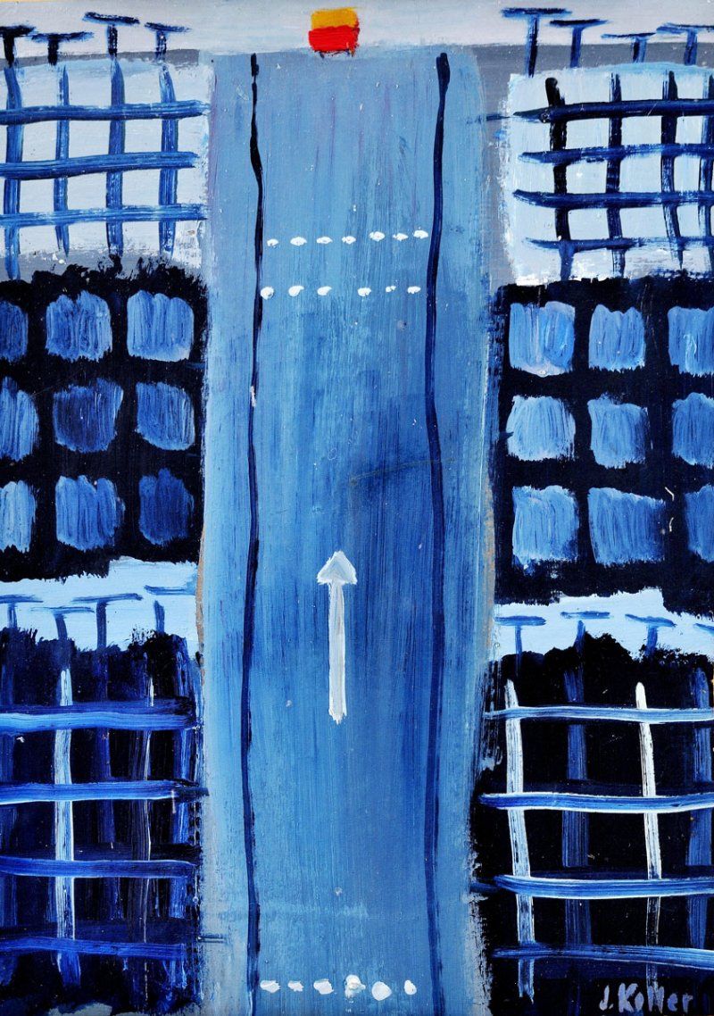 100 000,- Sk Mesto /s domácou televíznou anténou/. 1965. Latex na textile. 68 x 81 cm. (79. aukcia súčasného slovenského umenia, 20. 5. 2008)