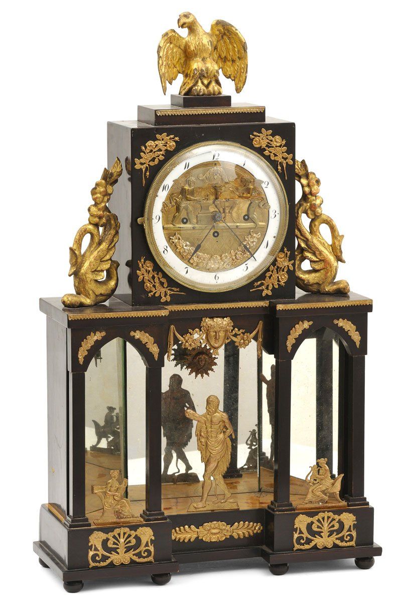 Technika: mahagónová skrinka, mosadz, vyrezávané, pozlátené drevo, zrkadlo