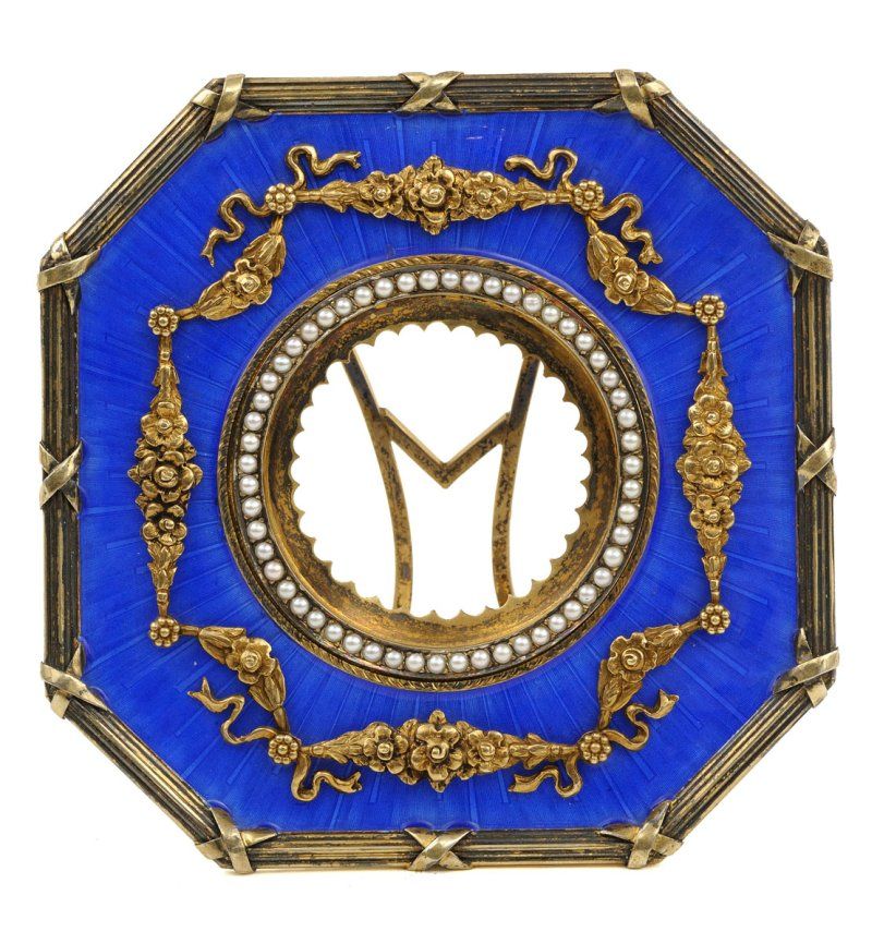 Technika: striebro 925, zlátené 18k zlatom, cizelované, emailová maľba, riečne perly