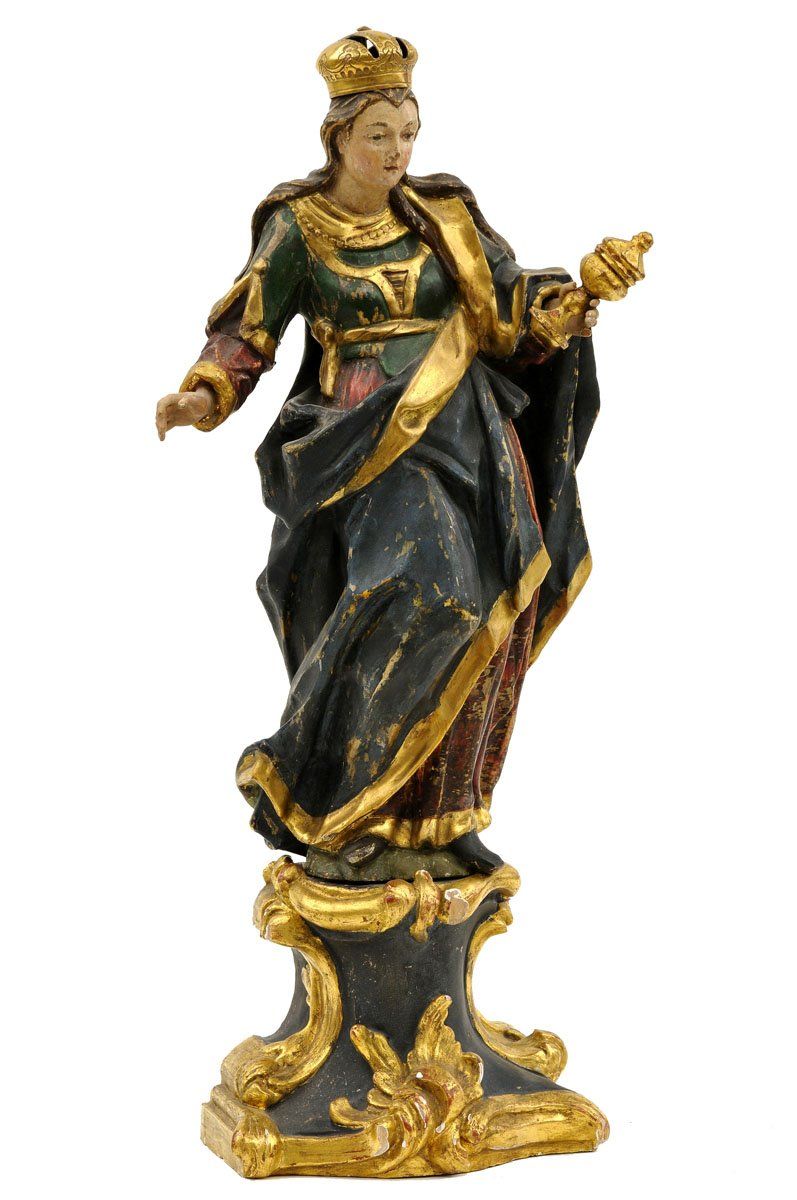 Technika: vyrezávané, polychrómované drevo, vyrezávaný podstavec