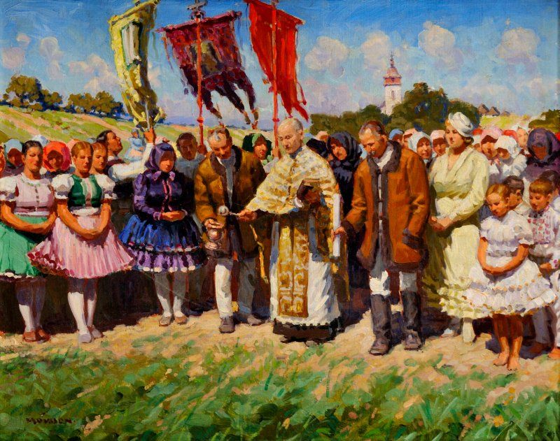 Popis: “Zelený štvrtok” je galerijným dielom vrcholu žánrovej tvorby Jozefa T. Moussona. Tento maliar z pomaďarčenej rodiny francúzskeho pôvodu a pôsobiaci trvale od roku 1911 v Michalovciach, sa sústredil na efektné rozprávačstvo obrazov mestských trhov, zvykoslovných scén i pracovných žánrových motívov. Postupom času si vytvoril autorsky príznakovú kompozičnú manieru s centrálne umiestnenou skupinou krojovaných ženských postáv v pohľade od chrbta (Trh v Michalovciach, okolo 1910; Námestie v Michalovciach s povozmi, 1915; Ulica v zime, 1917; Novembrový trh, 1917; Trh pod veľkým šiatrom, 1920; Na trhu v zime, 1922; Na trhu pred kostolom, okolo 1925). Moussonova maľba vrcholí až v závere dvadsiatych a v polovici tridsiatych rokov v nezameniteľnom súzvuku temperamentného rukopisu a dekoratívnych, niekedy až agresívnych farebných senzácií, čerpaných z bohatstva zemplínskeho folklóru, ktorého sa stal etnograficky síce dôsledným, ale navýsosť maliarskym monografistom.