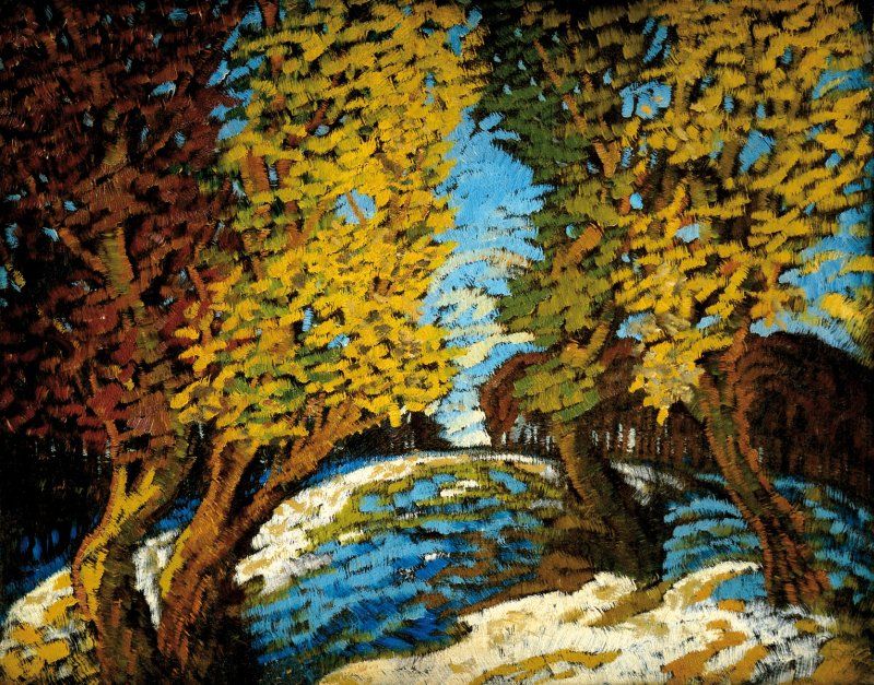 Popis: Olejomaľba „Jesenný les“ je výnimočným, galerijným dielom Antona Jasuscha z jeho prvého, nástupného obdobia rokov 1910 - 1914. Obraz bol súčasťou Jasuschovej bratislavskej výstavy roku 1924. Vzbudila nebývalý rozruch – tým, že sa konala práve v hlavnom meste Slovenska znamenala dnes už ťažko doceniteľný kultúrny prielom. Uvedomme si -- výboje košickej, či komárňanskej moderny boli dovtedy pre Bratislavu neznámym pojmom. Roku 1924 bol Benka ešte len na počiatku svojho druhého umeleckého vrcholu (jeho rané secesné diela boli na Slovensku prakticky neznáme). Rovnako počiatočné experimenty Alexyho, Bazovského, či Galandu zostávali predbežne skryté pred očami verejnosti v súkromí ateliérov (istú informáciu o najnovších modernistických pohyboch poskytla len bratislavská výstava Alexyho, Mallého a Foltýna v roku 1921). Bol to teda prvý modernistický čin, prijatý do súvislostí celonárodnej kultúry: "(Jasuschova tvorba) stavala nepripraveného diváka bezprostredne pred skutočnosť novej umeleckej estetiky. Secesia, symbolizmus, futurizmus, expresionizmus a pod. prestali byť mýtickými, iba v teoretickej rovine diskutovanými všeobecnými pojmami, ale stali sa v slovenskom umení skutočnosťou, ktorú nebolo možné obísť a ku ktorej bolo treba zaujať stanovisko." (Tomáš Štrauss). Jasusch ešte v roku 1924 reprízoval bratislavskú kolekciu v Prahe. Výstava však nemala prakticky žiadny ohlas. Od Herwartha Waldena dostal pozvanie na vystavovanie v berlínskej galérii Sturm. Nemal však peniaze ani na to, aby dopravil vlastné diela z Prahy domov... Toto všetko -- spolu s totálnym finančným neúspechom bratislavskej výstavy -- donútilo umelca, aby všetky vystavované obrazy predal na dražbe. Získal ich ten najoprávnenejší záujemca: Jasuschov bezvýhradný obdivovateľ, verný zástanca v zúrivých polemikách vyprovokovaných Jasuschovým radikálnym umeleckým činom. Majiteľom Jasusuchových najlepších diel a v neskorších neprajných dobách i jediným ich starostlivým kustódom a propagátorom sa stal -- celkom paradoxne -- slovenský nacionalistický novinár Jur Koza Matejov,