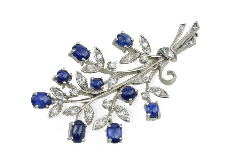 Technika: 14 kt biele zlato, tmavomodrý safír, cca 4 ct, brilianty cca 0,65 ct,
