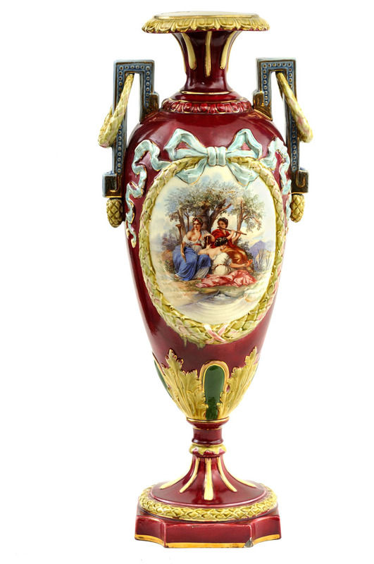 Technika: glazovaná terakota s ručne maľovanými výjavmi v medajlónoch