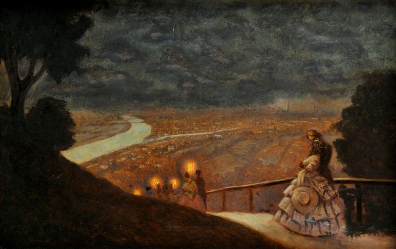 Lampionový sprievod nad večernou ViednouPanoráma nočnej Viedne